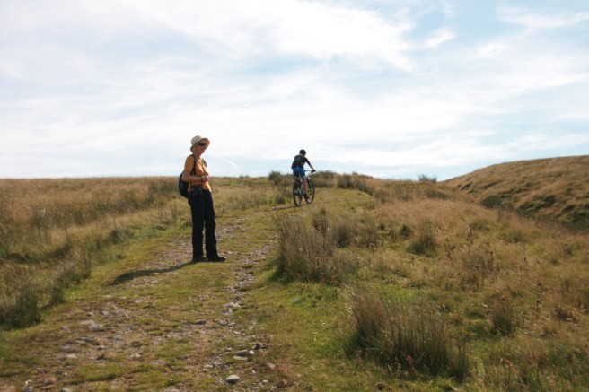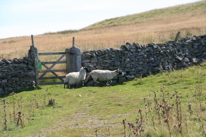 After about three-quarters of an hour, or less if you are younger / fitter than your scribe, you will see a wall slicing across your path. Do not go through the gate. Instead turn right, to leave the bridelpath and follow the wall up the hill towards the crest.
