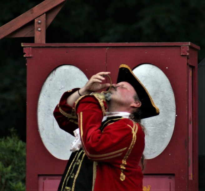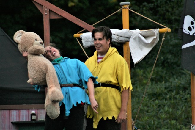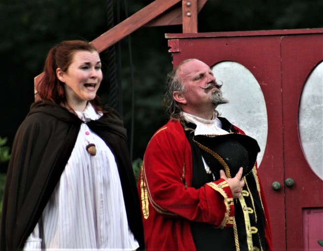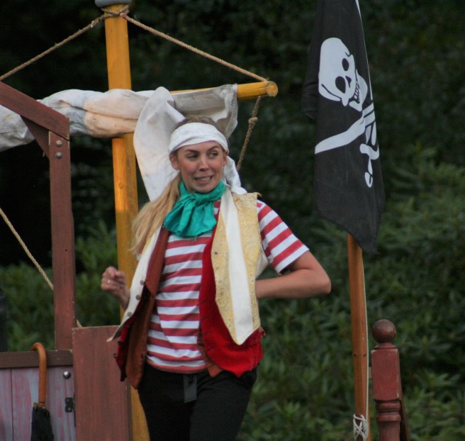 Before we get carried away on a spring tide of adulation it is important to point out this vessel had some leaks. As for the younger folk whose early exposure to theatre is its long-term life blood, well, not all remained fully engaged throughout, but there is a critical distance for all age groups when playing to an audience and out of doors that barrier is more elastic. Those in the picnic blanket mosh-pit at the front seemed securely on board and supplied the most welcome of shared experience heckles. Those further away sometimes found distraction in their immediate surroundings – but that’s an intrinsic danger of daylit picnic productions.