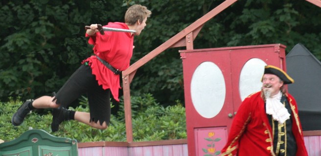 The trinkets of invention were scattered across this beach of a show like the booty of a fleeing buccaneer. Tinker Bell – sometimes just a delightfully hyperactive duster on a fishing pole, and at others a benevolently menacing doll in the hands of a puppeteer that she seemed to command rather than be controlled by – was emblematic of the way Oliver Gray, the show’s director, adhered to and also re-imagined this classic tale. Tinker Bell lived and then somehow lingered when not there, ready to reappear at the inhale of a summons.