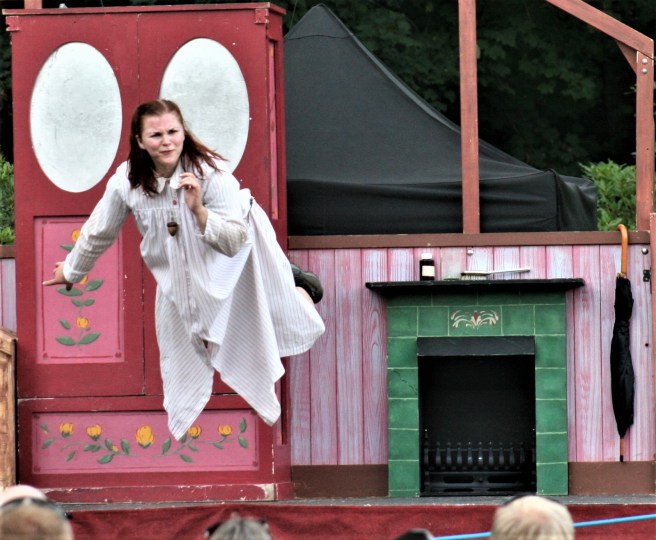 This company understand theatre. It’s not complicated. One group of people have a story to tell and another wants to see and hear it. Those two requirements of the audience are crucial, yet so often their delivery falls short. Not in this case, and outdoor theatre is especially demanding. We were sitting at the rear edge of a fan-shaped space holding five hundred picnicking punters and we heard every word. Every syllable.