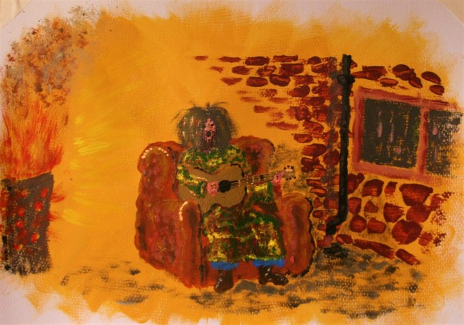 A brazier improvised from a punctured dustbin blazed like a dozen dragons caged, as box after secret box was tossed into its grateful gape, by a brass-tinged Mother Eartha. Meanwhile, Christopher once Proctor, now Iris strummed a guitar than had seen better ballads. She wore a dress over a pair of jeans that Nathaniel was sure he had seen on Jamaican Joel, and boots that he’d been told once belonged Deborah’s dad. Iris was sitting on Telescopic Titus’s hippopotamus hide armchair, which they’d somehow brought down from the attic room. She was part way through one of her own compositions.
