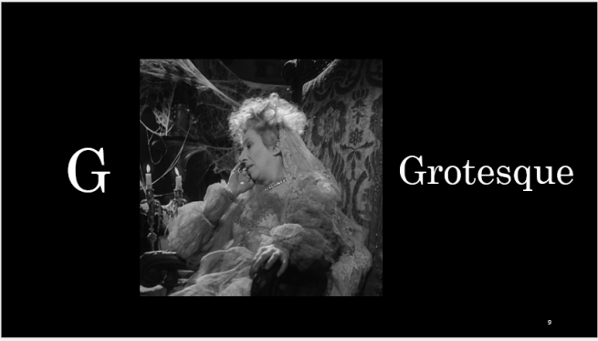 The repulsive image in a Gothic story is frequently found among the beautiful, or emerges from behind the banal, or is a transformation from the attractive into the repellent. Consider, for example, the first classic gape of a handsome vampire. Another example is Miss Havisham from Dickens’ Great Expectations (pictured in David Lean’s movie above) surely one of the most grotesquely damaged of all of Dickens' characters.