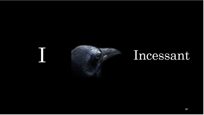 This is where, in the live lecture, I chose to read the opening of my Modern Gothic story, Livid. The reader can make their own mind up as to whether or not there are ghosts in this story, but that luxury is not granted to Alban, the protagonist. He is a haunted man. The haunting contains grotesque images and is interminably ominous. His behaviour becomes theatrical, as does that of those around him, in a literal as well as symbolic sense. The relentless pressure deepens and thins but never completely goes away. This is typical of Gothic. Think of the birds in Hitchcock’s movie. Even when they are not in shot, we know they are there. And they are there, Until the very end. And beyond. I’ve just brought them back by using the title.