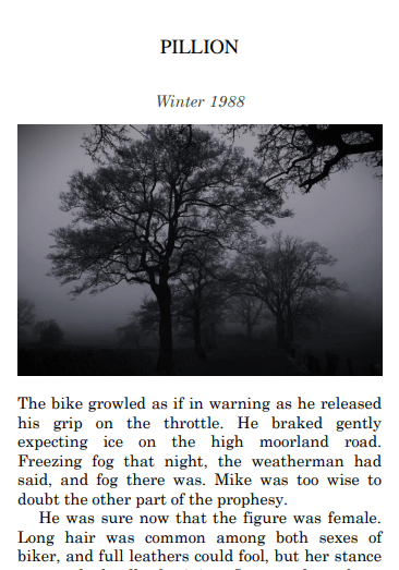 I had two motorcycles as a teenager. The first was a rather ineffectual mule known as a Yamaha 80, but that was replaced by a much-loved Honda CB125. This story, inspired by negotiating icy patches while motorcycling through the Trough of Bowland, was written a decade later in response to a submission request by BBC Radio Merseyside.