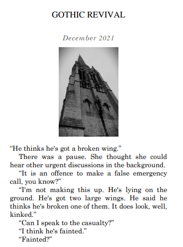 This was written two years before I was prompted to write a new Gothic tale for the recent Fly on the Wall anthology. This somewhat light-hearted story was suggested by the architectural label and the magnificent example of the same that graces the Preston skyline. (Keep your eyes peeled for it if you are travelling by train.) Designed by Joseph Hansom (who designed the original Hansom cab), it boasted the third tallest spire (after Salisbury and Norwich cathedrals) in the country. Each spring that spire becomes a premium nesting site for peregrine falcons. You can see and hear them. With a snippet of imagination, they could be soaring and falling angels. The rest, is this story.
