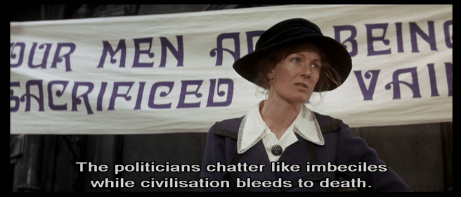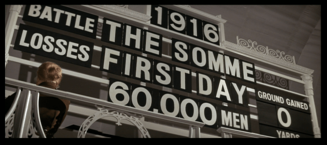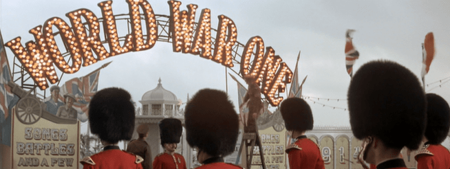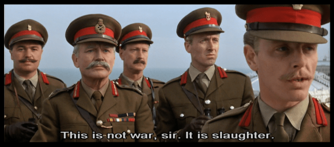 The luxury, idiocy and brash decoration of commanders and leaders was shown in all its intrinsic hypocrisy. The whole debacle was dressed initially as a kind of public parade. This was shown spectacularly brilliantly in Richard Attenborough’s film adaptation by using Brighton’s West Pier. Attenborough, dressed the soldiers in period uniforms, and unlike Joan, did not avoid depicting deaths. He also promoted the comma in the title to an exclamation mark.
