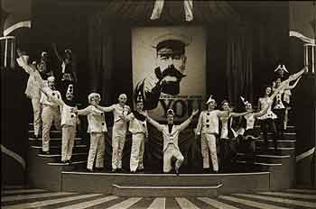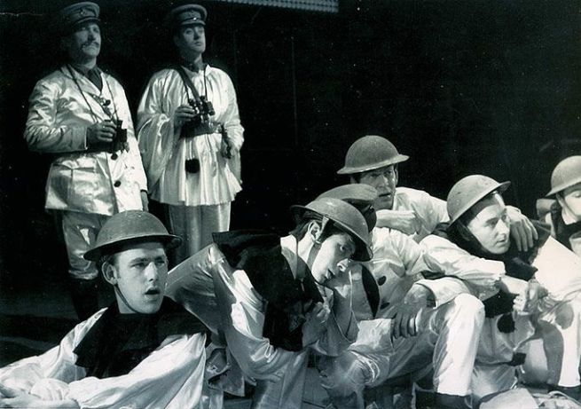 Joan dressed the soldiers as Pierrot clowns. She hated the khaki uniforms and all they stood for, and wanted the audience to leave laughing at the vulgarity of war after watching the sad clowns singing humorously about their inescapable predicament. Gerry Raffles acquired a huge news panel, a spectacular precursor of the giant screens so common today. The soldiers’ light-hearted ditties were set against the abominable losses of troops for pathetic, and often zero, gains in territory.