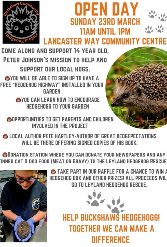 I will be supporting this marvellous initiative established by Peter and Emma Joinson. I’ll be taking along some copies of Great Hedgepectations for sale at £5. I’ll also have a smattering of my other books available. All profits on the day will go to Leyland Hedgehog Rescue, and in the case of Great Hedgepectations, the whole purchase price will be donated.
