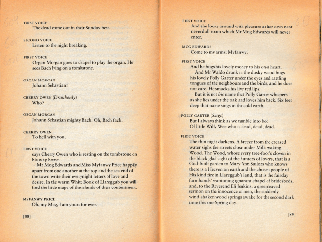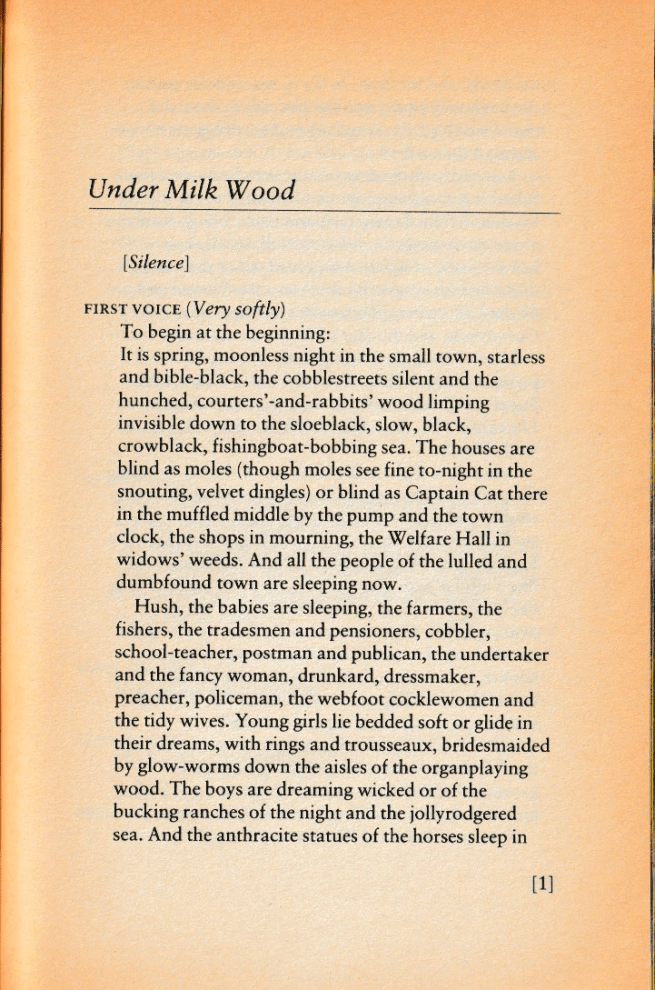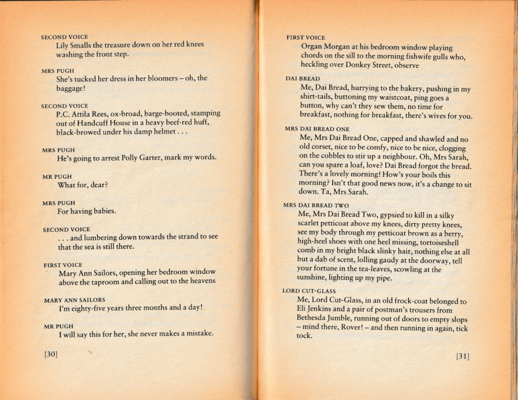 It is not a perfect play. Dylan Thomas admitted it was unbalanced. The opening monologue describes the pre-dawn on page one of my much-thumbed 1985 edition, and ‘the morning school is over’ sixty pages later, but the afternoon, evening and night are all crammed into just thirty more pages. Thomas did write more material for the latter half but not in time for the deadline he’d been given. He met his own premature terminal deadline two months before the premier broadcast. The incomplete play is therefore the final edition.